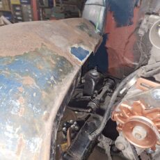 Der geschwungene Rand zu den Kotflügeln bereitete mir zunächst Kopfschmerzen. Das ist gleich in zwei Richtungen gebogen. Das kann man nicht so leicht biegen, schon gar nicht ohne spezielles Werkzeug. Was tun? Ich entschied mich für folgende Methode: Ich habe ein Vierkantrohr in kleine Stücke zerschnitten. Dann das erste Stück an den Rand mit ner Gripzange an den Restrand geklemmt.