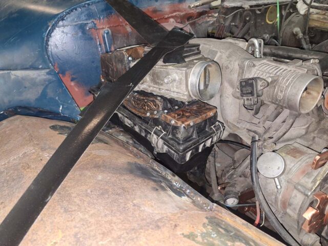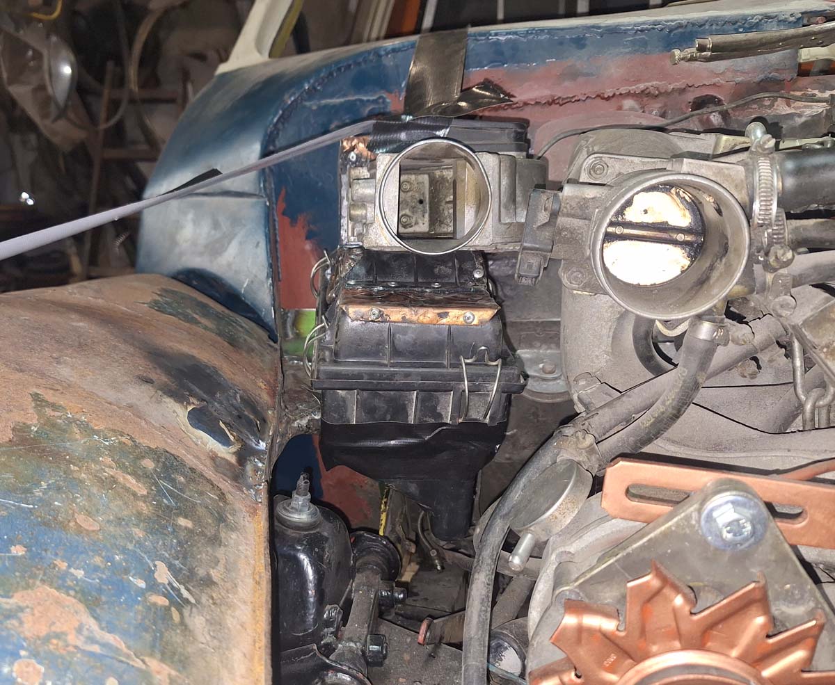 Ich musste auch den Ansaugrüssel abtrennen. Den muss ich dann hohl nach vorne verlegen. Der Scheiß hört nicht auf. Aber dafür wird man die Kupferbastelei letztendlich ganz gut sehen bei geöffneter Haube.