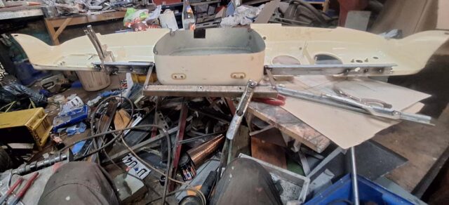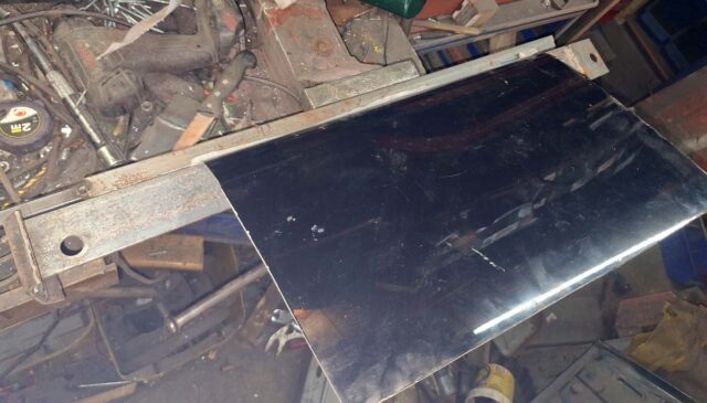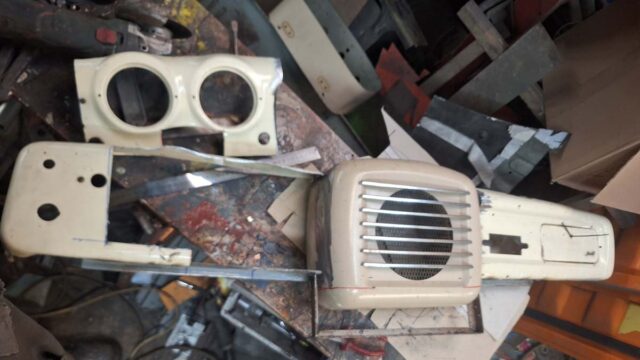 Das Armaturenbrett des ColdRod war ja nur mit ein paar Schweißpunkten zusammengesetzt. Aber ich will ja auch einen anderen Tacho verwenden, also musste ich erst einmal die Öffnungen für die Instrumente ändern. Ich will ja einen Tacho von einem Weltkugel Taunus einsetzen, der übrigens auch im Ford FK 1000/1250 verbaut war. Also musste ich das Armaturenbrett weiter umschweißen. Vorher musste ich das unten erst einmal provisorisch verbinden – auch um die Flucht herzustellen. Ich habe dazu etwas aus Resten zusammengeschweißt.