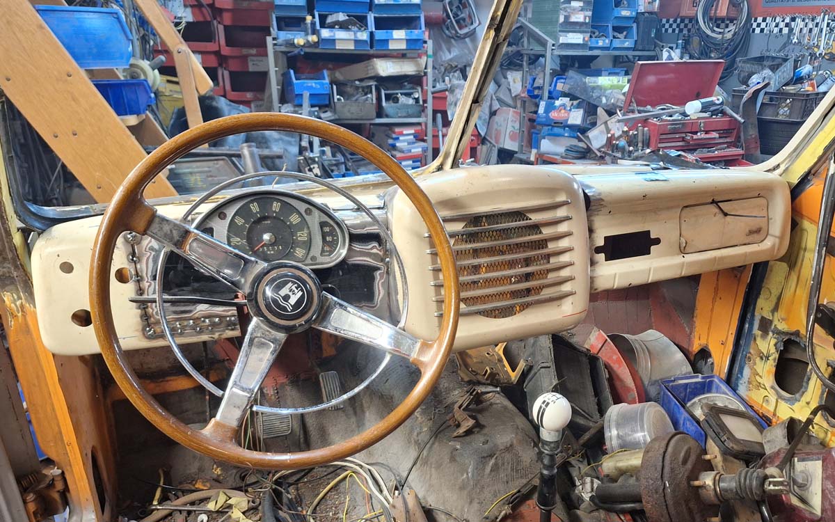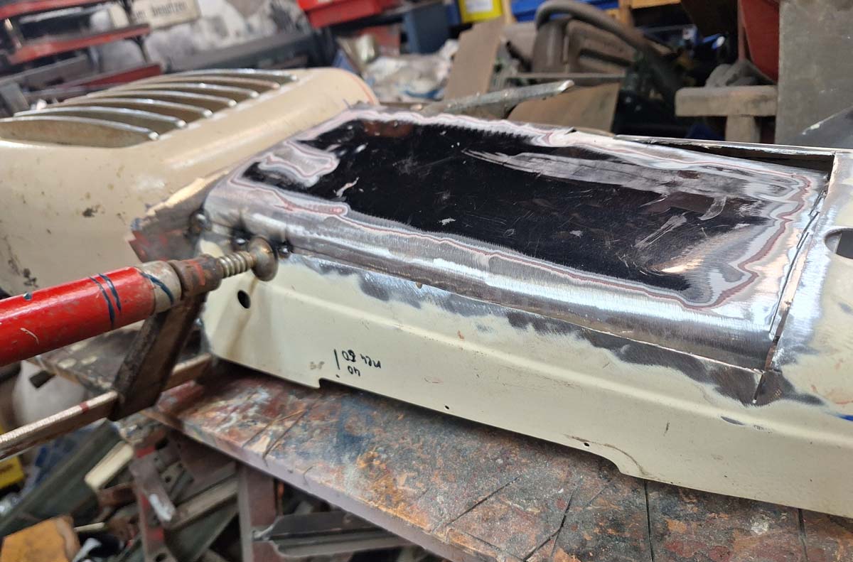 Das Armaturenbrett des ColdRod war ja nur mit ein paar Schweißpunkten zusammengesetzt. Aber ich will ja auch einen anderen Tacho verwenden, also musste ich erst einmal die Öffnungen für die Instrumente ändern. Ich will ja einen Tacho von einem Weltkugel Taunus einsetzen, der übrigens auch im Ford FK 1000/1250 verbaut war. Also musste ich das Armaturenbrett weiter umschweißen. Vorher musste ich das unten erst einmal provisorisch verbinden – auch um die Flucht herzustellen. Ich habe dazu etwas aus Resten zusammengeschweißt.