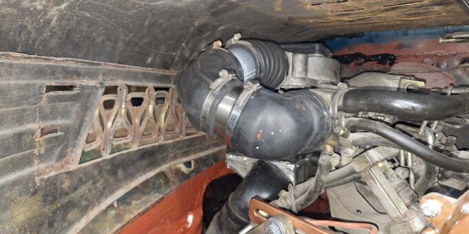 Der Luftfilter war erneut umgebaut. Sollte jetzt eigentlich passen. Aber er musste ja noch befestigt werden. Bedeutete erst einmal Kotflügel wieder anbauen. Ich hätte mal eine Statistik anfangen sollen, wie oft ich den ab- und wieder anmontiert habe.