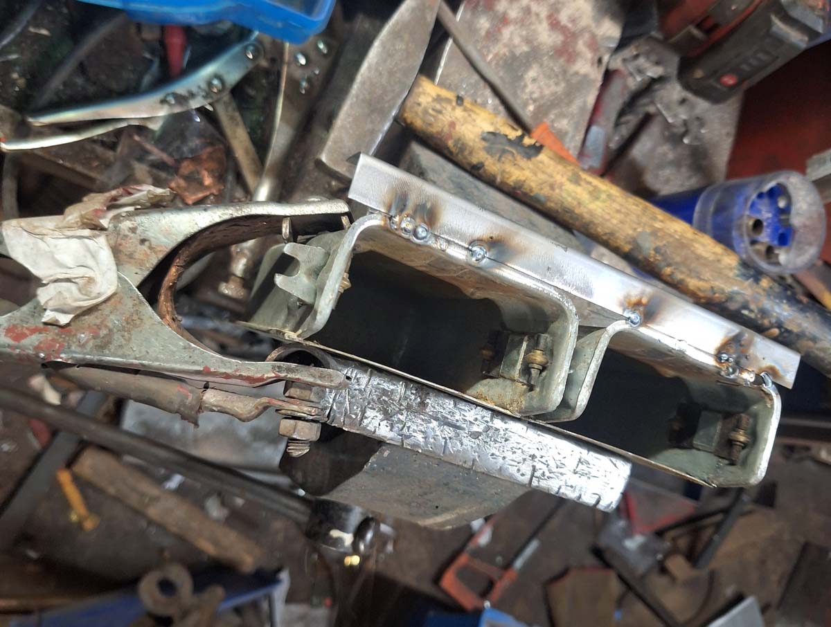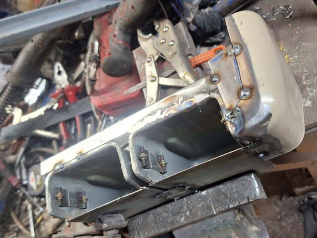 Den hatte ich damals verworfen, weil das Gitter nicht demontierbar war und der andere rockt deutlich mehr. Aber so war das auch kein Fehlkauf. Also die Ecken abgetrennt, leider musste ich noch ein Blech zusätzlich reinsetzen, weil das Gitter eben gepresst war. Wie üblich arbeitete ich wieder einmal mit Überständen – wegschneiden kann man immer noch.