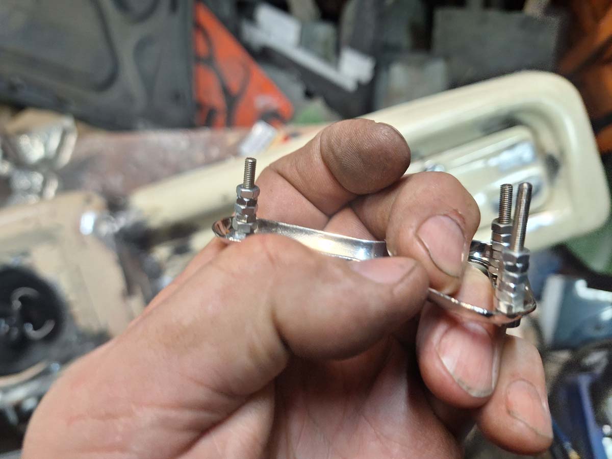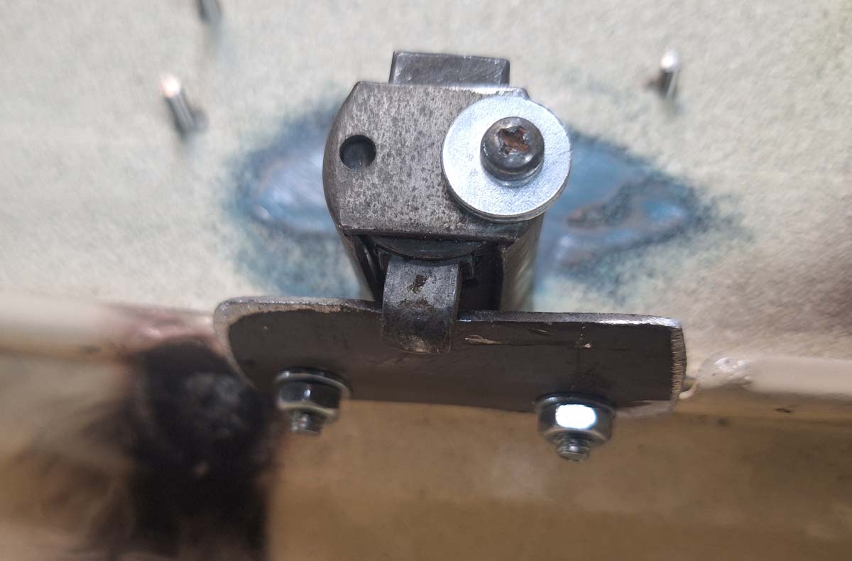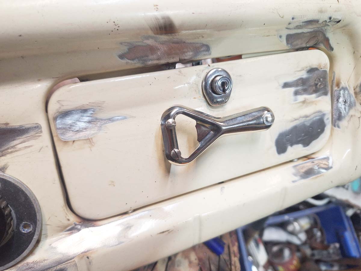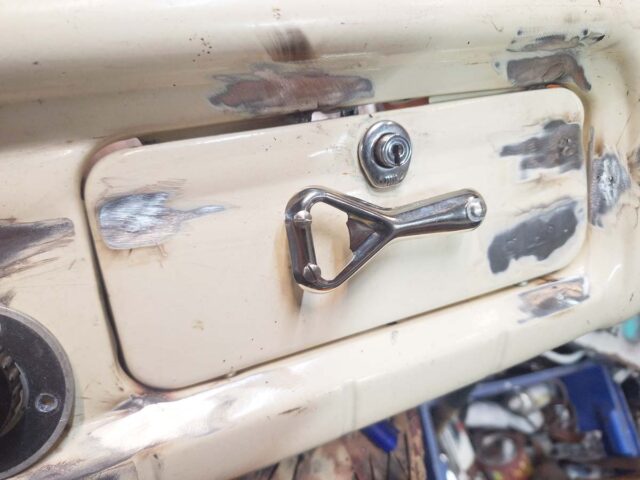 Fehlte noch ein absurder Griff. Und da ich ja in der Motorhaube die Flaschenöffner habe, habe ich durch eben so einen Kapselheber drei Schrauben gejagt und mit Muttern für Abstand gesorgt.