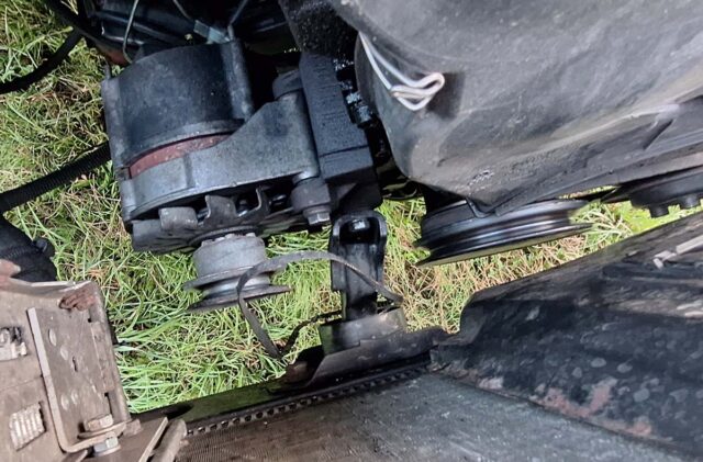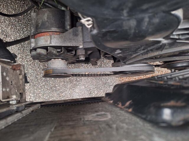 Klar: Ich baue jetzt einen neuen Keilriemen ein, dann auch mit Drehmomentstütze. Und natürlich gehe ich dem Eiern der Riemenscheibe auf den Grund. Denn so alt war der Keilriemen noch nicht…