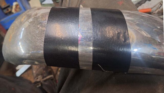 Ich wollte aber einen runden Abschluss. Also war der Plan ein Zwischenstück herauszutrennen und den Abschluss wieder dranzuschweißen. Die Schnitte sollten parallel verlaufen. Deshalb habe ich mit Klebeband gearbeitet.