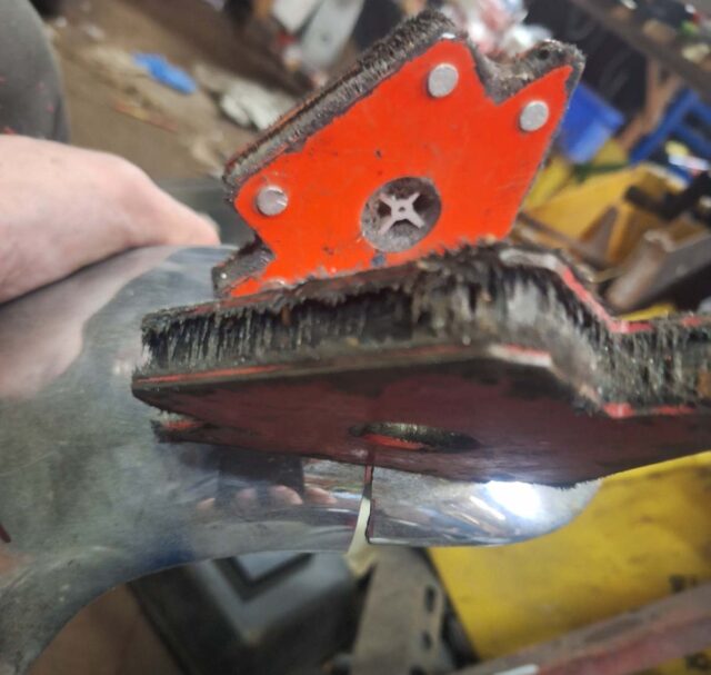 Jetzt kommt aber das große ABER: Ich habe die Stoßstangenhälfte einmal angelegt, wo ich jetzt stehe. Der Punkt war zwar mies ohne Gas, das Teil aber fixiert. Dabei ist mir das heruntergefallen, weil ich es nicht mit Tape fixiert habe und jetzt ist die anzuschweißende Ecke weg. Spurlos verschwunden. Was hab ich gesucht – ohne Erfolg. Ich habe sogar die gefüllten Mülltüten wieder geleert. Nix. Das Teil ist so fies irgendwohin weggesprungen – ich finde es schlichtweg nicht. Kisten, die offen rumstehen untersucht. Ohne Erfolg.