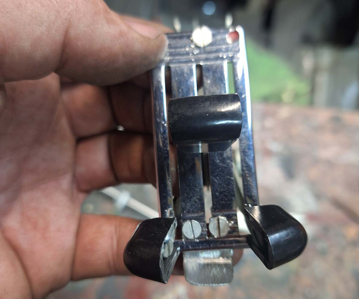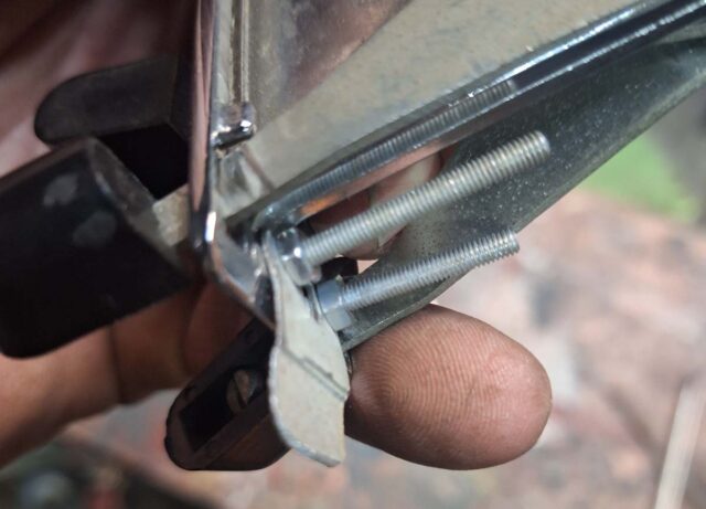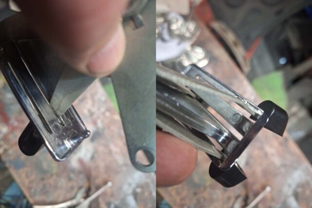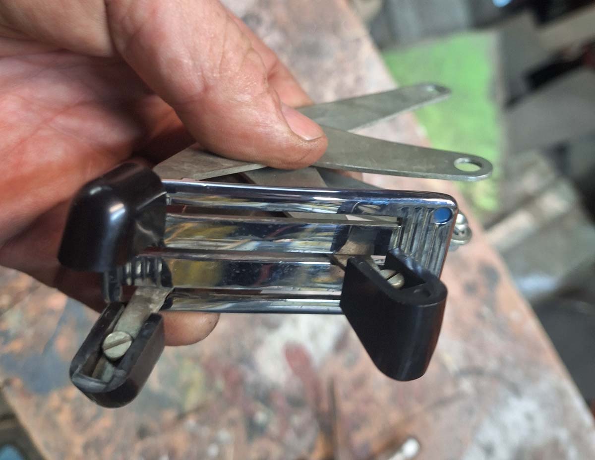 Eine Schraube ersetzt den Haltestift, für die Klammer fehlt, die anderen zwei halten ein kleines Blech, das die Haltenasen ersetzen.