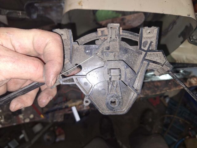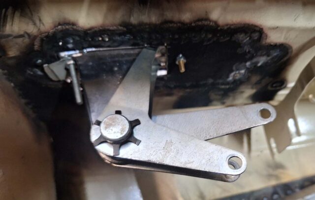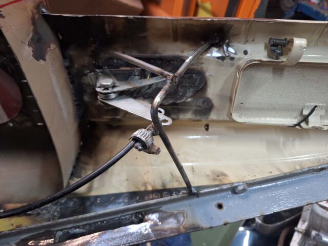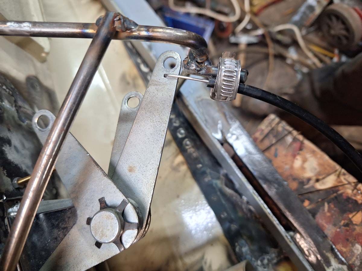 Das „Gestell“ ist absichtlich so schief, um mit den späteren Luftkanälen der Lüftung nicht zu kollidieren. Der Zug ist ein fester Draht, deshalb einfach ein Loch in den Hebel. Und das funktioniert wunderbar.