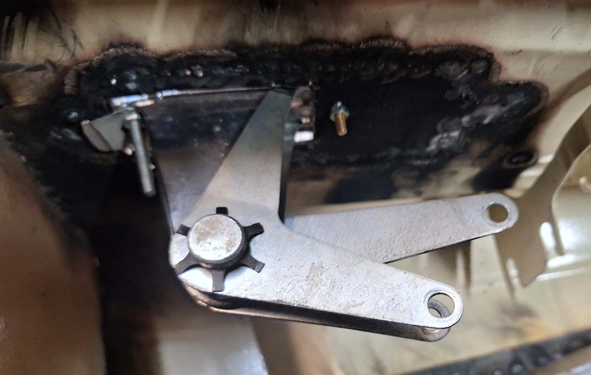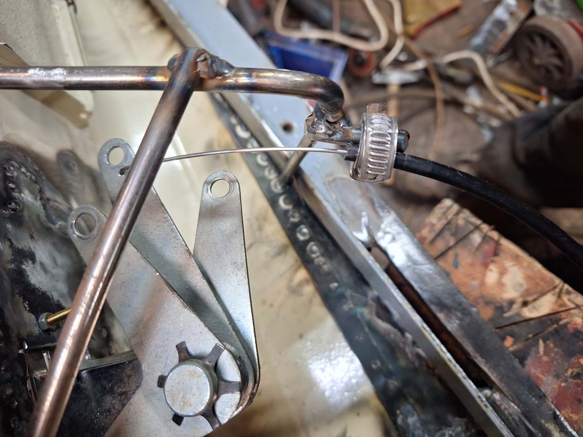 Es kam nur der mittlere Hebel des DKW Teils in Frage. Aber der Heizungsregler hatte keinen Gegenhalter für den Zug. Also wieder einmal selber bauen. Ich habe das mit Rundstahl verwirklicht. Den Zug habe ich mit einer Schlauchschelle befestigt. Damit das nicht abrutscht, habe ich am hinteren Ende einen Schweißpunkt gesetzt.