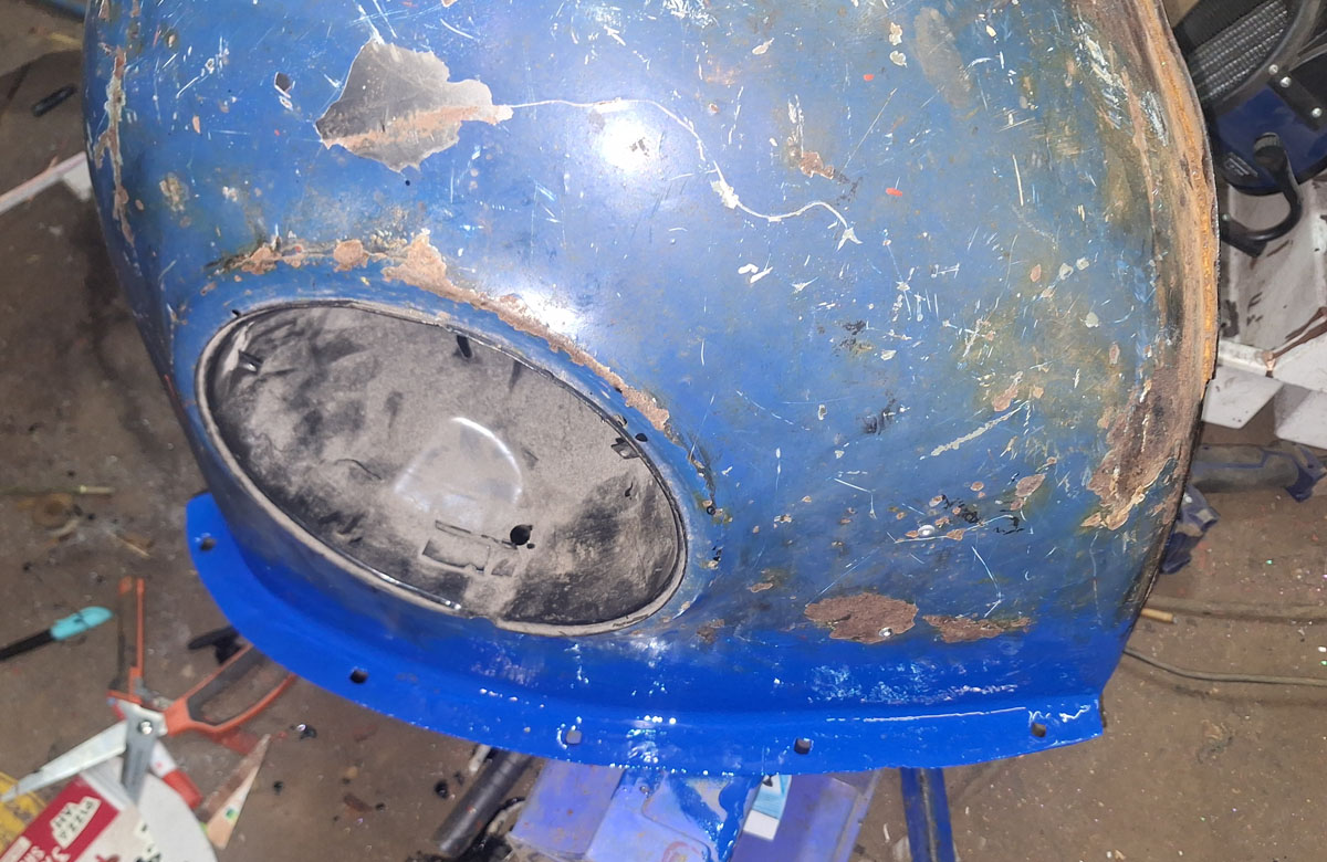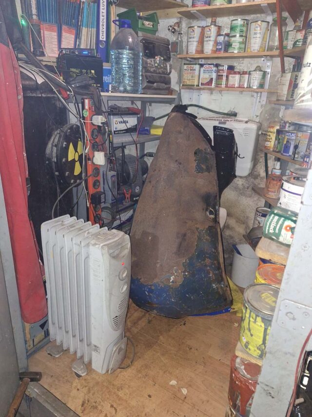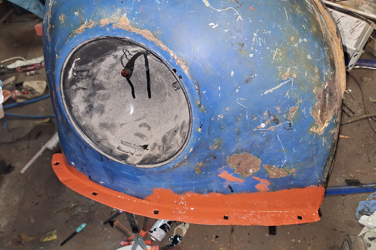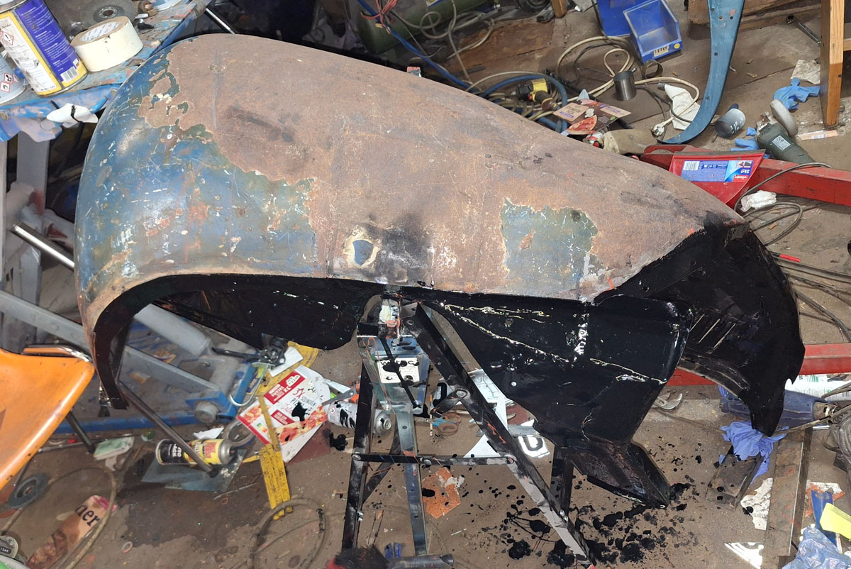 Beim vorletzten Mal hatte ich ja den Kotflügel mit Rostwandler behandelt, beim letzten Mal dann grundiert…
