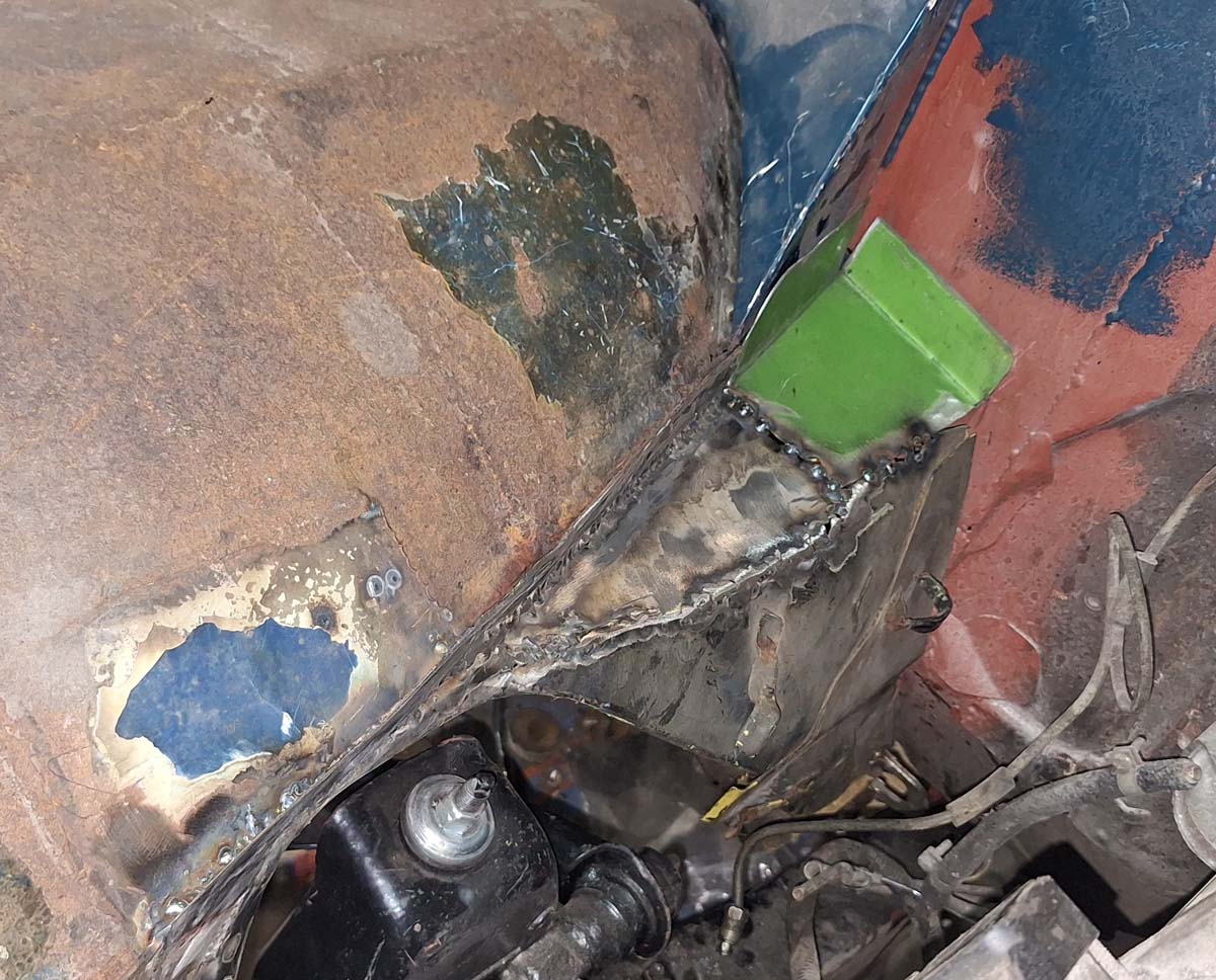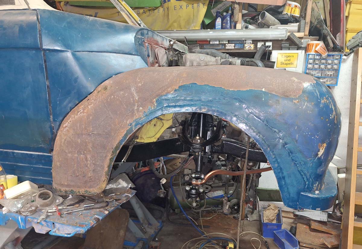 Ich habe fast das Gefühl, an dem Kotflügel ist inzwischen mehr Schweißnaht als Blech. Wie ich das nach vorne schließen werde, weiß ich ehrlich gesagt noch nicht. Aber da werde ich genauso vorgehen – einfach anfange. das ergibt sich schon. Vielleicht findet sich da noch der Platz für die Batterie. Mal sehen.