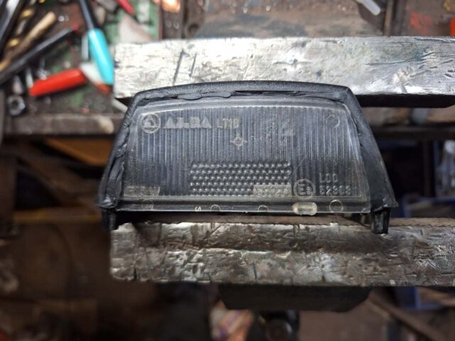 Leider hatte ich keine identische Kennzeichenleuchte da, aber ein ähnliches Glas. Das habe ich dann provisorisch mit Dichtmasse eingeklebt.