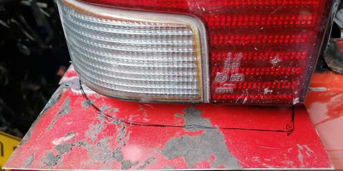 Der Rahmen um die Heckleuchte auf der Fahrerseite des Prolos war noch nicht komplett. Eigentlich war das nur oben und seitlich fest, unten ein Provisorium, um die Position zu fixieren.