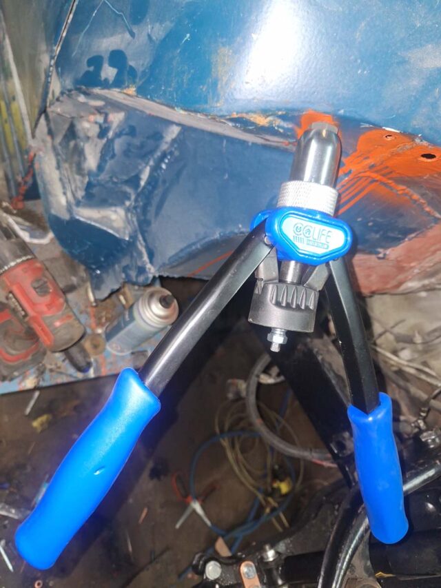 Ich will ja Kennzeichen als Radkasten einnieten, aber vorher war am ColdRod noch einiges zu tun. Ach, wie mich das nervt, wenn mich lauter so notwendige Arbeiten am kreativ sein ausbremsen. Bisher hatte ich den Kotflügel einfach mit Blechschrauben verschraubt. Da das mitten in die Karosserie geht, kann ich nicht mit Blechmuttern arbeiten. Das reißt gerne aus. Deshalb habe ich mir jetzt ein Set für Nietmuttern besorgt. Also Löcher aufbohren und rein mit den Nieten.