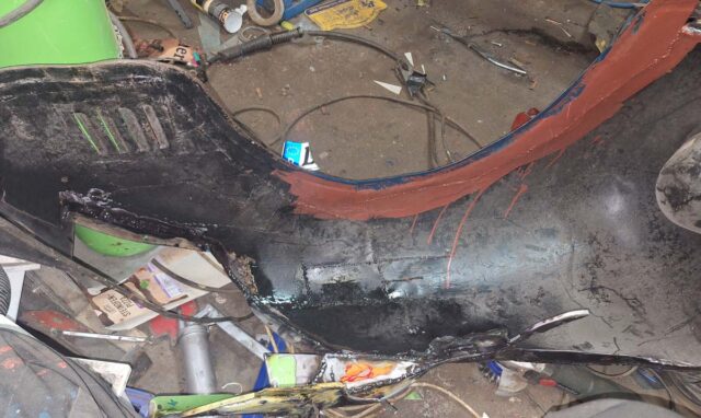 Also wieder mal Schweißen. Einen Blechflicken dransetzen und bei der Gelegenheit gleich noch einmal das unnötige Loch zubraten, durch das früher das Trittbrett festgeschraubt war. Auf Rost schweißen – nicht meine Lieblingsdisziplin.