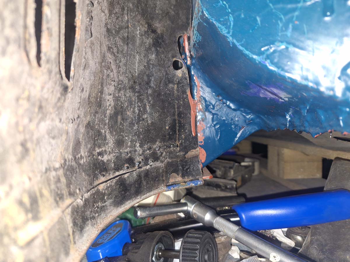 Also wieder mal Schweißen. Einen Blechflicken dransetzen und bei der Gelegenheit gleich noch einmal das unnötige Loch zubraten, durch das früher das Trittbrett festgeschraubt war. Auf Rost schweißen – nicht meine Lieblingsdisziplin.