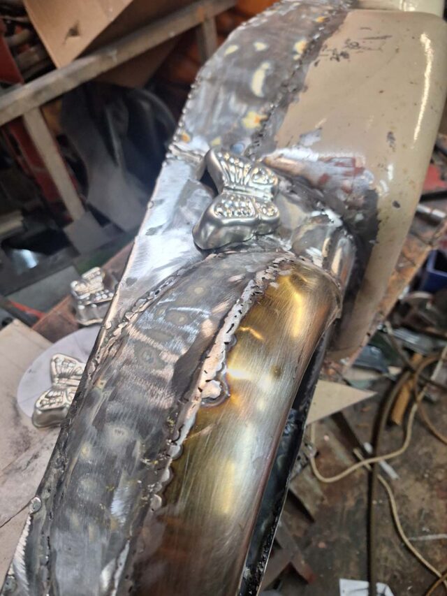 Ich habe die Enden absichtlich leicht zu lang gemacht, um dann am Objekt die rüstige Länge zu finden. Reingehalten, überprüft, dann etwas mit der Fächerscheibe weggenommen, reingehalten… Bis es eben passte. Samt Schalterleiste jeweils zwei Punkte gesetzt, Schalterleiste raus und dann richtig verschweißt.