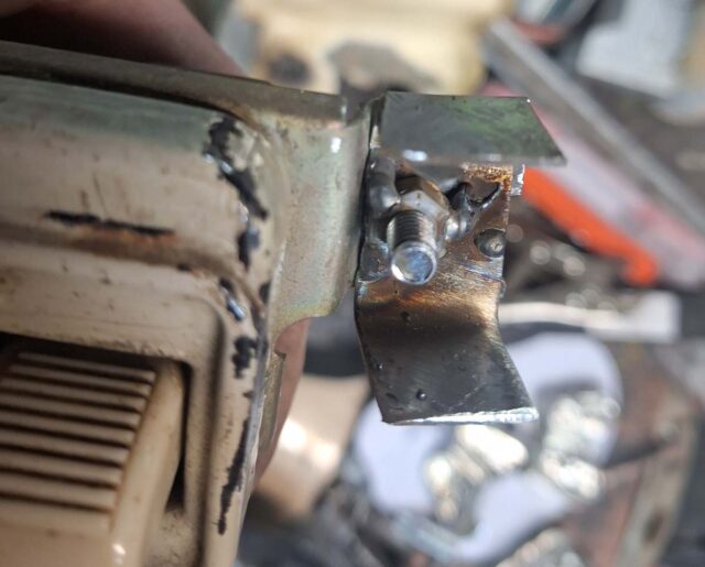 Die Grundplatte musste ich leicht richten, was kein Thema war – war eben die billigste Schalterleiste im Angebot. Nun sollte der Rahmen nach vorne rausstehen. Dazu habe ich zwei U-Winkel gebogen und Muttern drin festgeschweißt, do dass ich die Leiste später ohne großes Fummeln festschrauben kann.