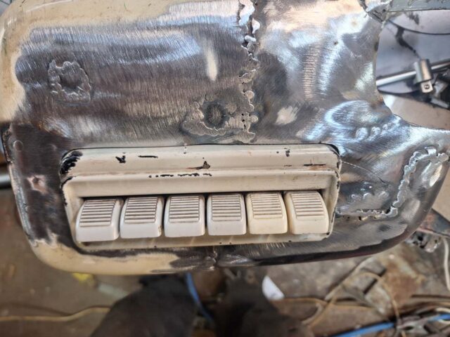 Jetzt sitzt die Schalterleiste fest drin, natürlich wieder rausschraubbar. Und ich mag das, dass das etwas raussteht. Verschweißen hätte ich das übrigens nicht können. Der Rahmen um die Schalter ist Bakelit.