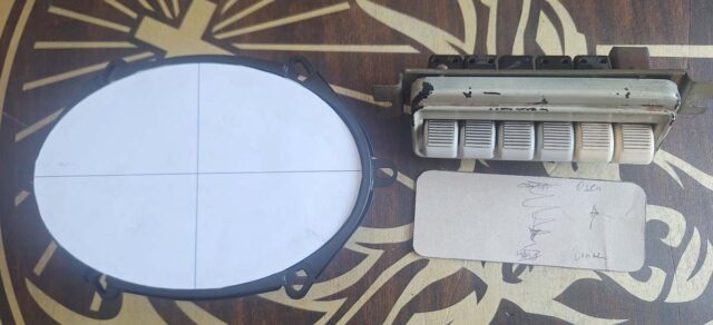 Weiter mit dem Lautsprecher. Die Waren für die Montage in originalen Befestigungspunkten von Serienfahrzeugen gedacht. Bedeutet, es war kein Gitter dabei, was ich auch nicht brauche, aber auch keine Einbauschablone. Und genau deshalb habe ich die Schablone zu Hause gemacht, weil so konnte ich auf dem PC Linien genau mittig positionieren, was die Ausrichtung später erleichtern sollte.