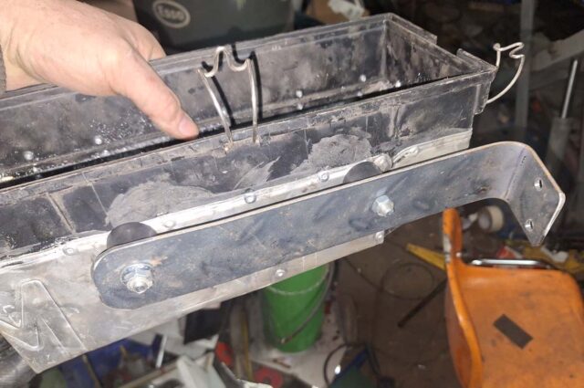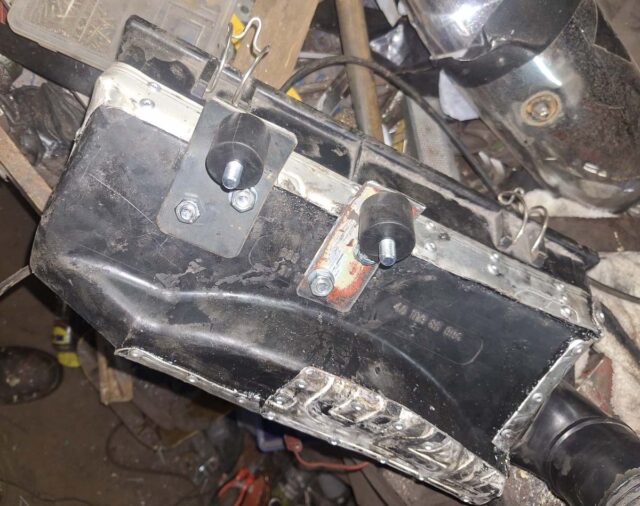 Die Befestigung des Luftfilters habe ich auf Kotflügelseite angefangen. Wei Halter aus dickem Material aus der Restekiste gebaut und daran Gummipuffer befestigt.