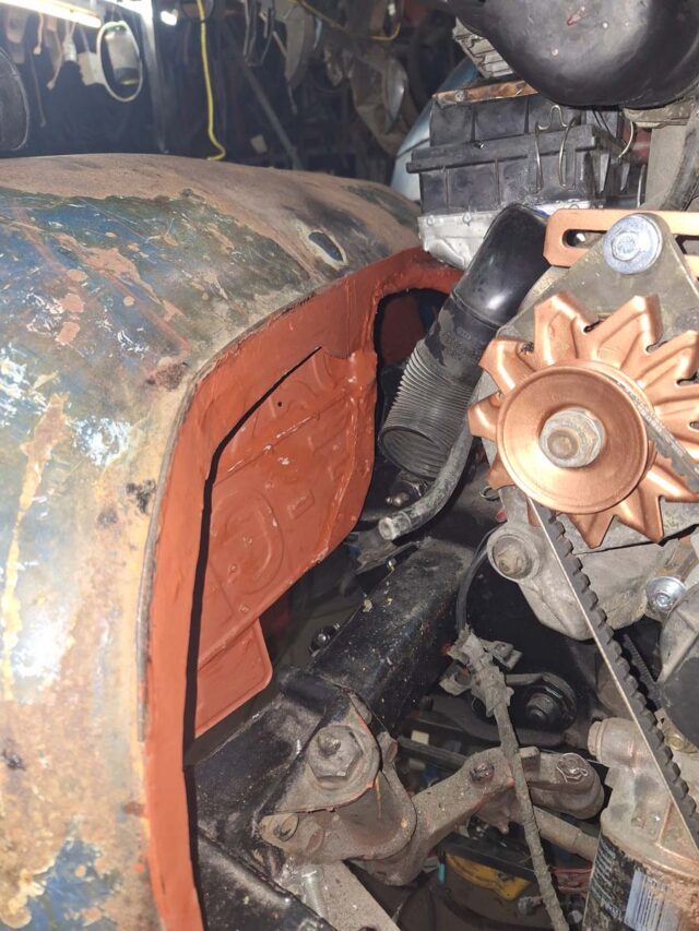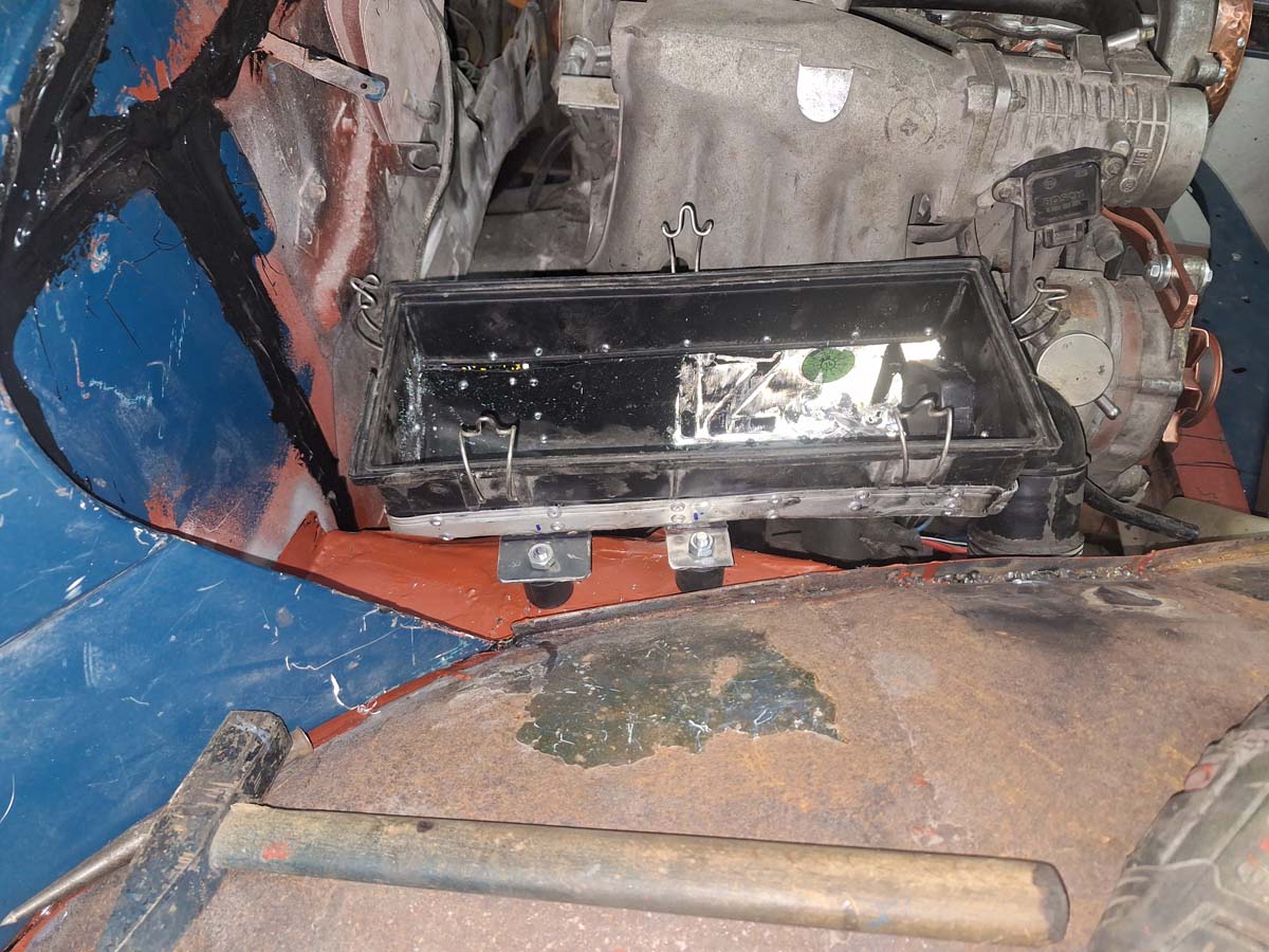 Der Luftfilter war erneut umgebaut. Sollte jetzt eigentlich passen. Aber er musste ja noch befestigt werden. Bedeutete erst einmal Kotflügel wieder anbauen. Ich hätte mal eine Statistik anfangen sollen, wie oft ich den ab- und wieder anmontiert habe.