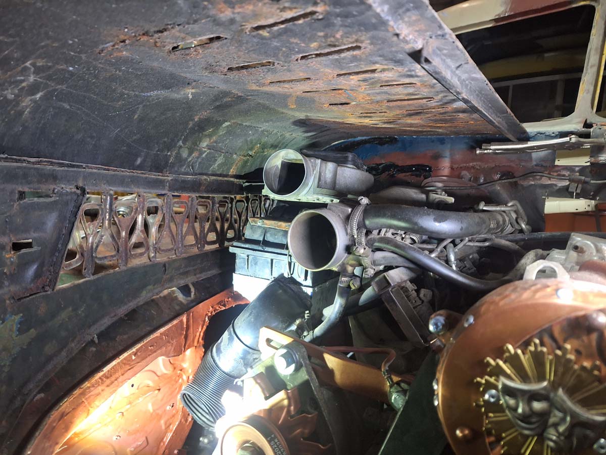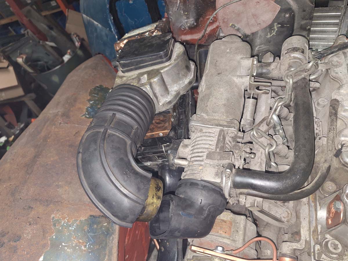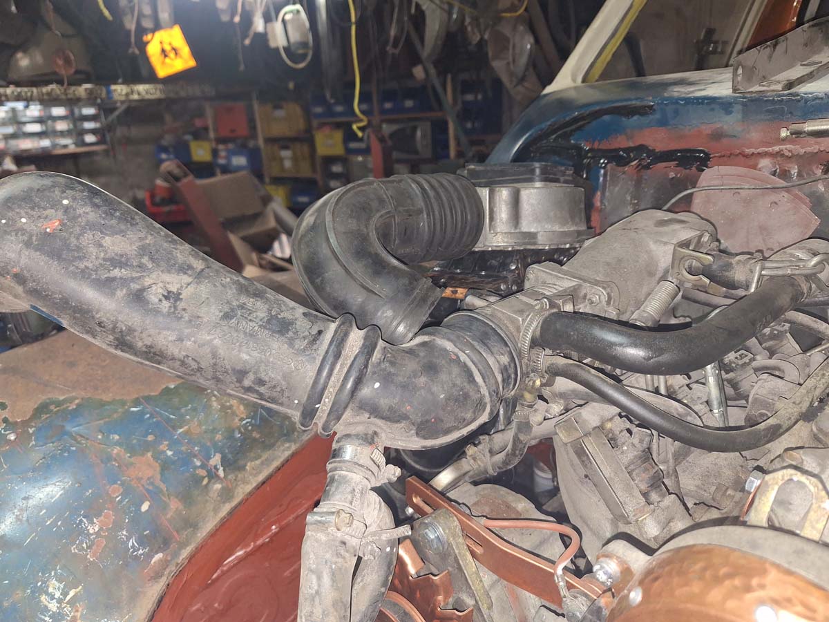 Keine Zeit, eigentlich hätte ich die Schrauben an den Halter braten sollen, den Innenkotflügel final lackieren sollen etc. aber ich bin ja ein Spielkind und wollte wissen, wie ich den Ansaugschlauch anschließen kann. Ich hatte da als Basis den 1,-€ Schlauch von der Veterama aus unbekanntem Spenderfahrzeug und einen Schlauch vom Passat 32B Turbodiesel.