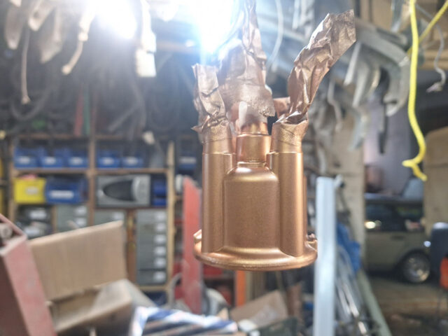 So habe ich die Riemenscheibe, den Windflügel und den Halter der LiMa kupferfarben lackiert. Aber mich störte auch die Farbe der Verteilerkappe. Mal sehen, ob das hält mit einer Grundierung mit Mipa Haftpromoter hält.