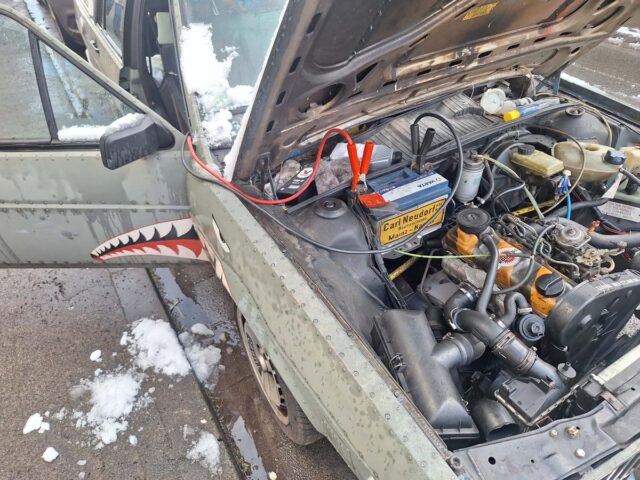 Aber zurück zum Pirat. Die Batterie ist – ich habe es im Blog nachgelesen, 10 Jahre alt. Stolzes Alter für eine Autobatterie. Und natürlich sprang auch mit der anderen LiMa der Bock Rosenmontag nicht an. Michael hatte mir eine fette Starterbatterie mit fest installierten Starterkabeln mitgegeben. Steht im Beifahrerfußraum. So starte ich das Auto gerade.