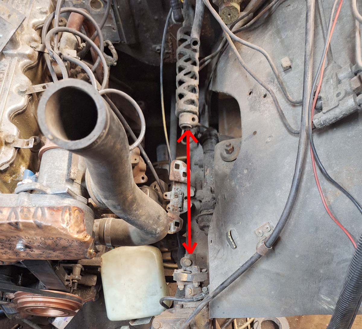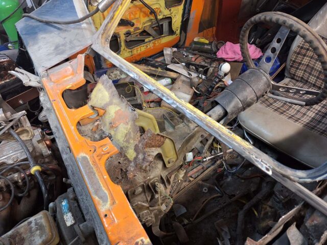 Dann konnte die alte Lenksäule raus. war nicht ganz so easy. Das Lenkrohr war an der Stirnwand verschraubt – mit Kreuzschlitzschrauben! Kann man sich ja denken, wie gut die nach 46 Jahren aufgehen. Also gar nicht. Man bekommt einfach keine Kraft auf die Schrauben. Mir ist tatsächlich ein Schraubendreher daran abgebrochen – einer von HAZET wohlgemerkt.