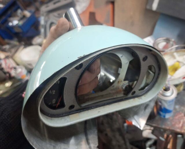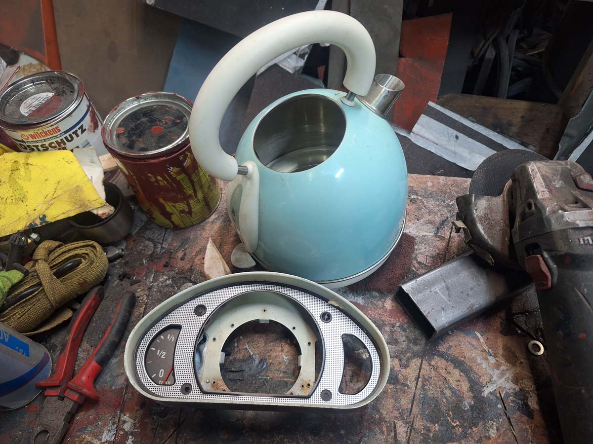Das Armaturenbrett wird natürlich breiter. Und da muss der Ford Tacho rein und ich habe mir den Kopf zerbrochen, wie ich die Rundung hinbekomme. Ich hatte mir einmal einen Retro Wasserkocher auf dem Flohmarkt gekauft und schnell wieder ausgemustert, weil der ewig brauchte, warm zu werden.