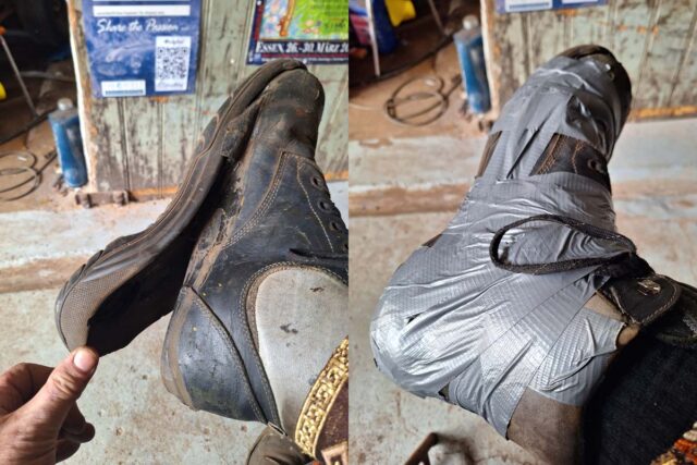 Beim Einladen wurde es auf einmal unkomfortabel, irgendetwas stimmte nicht. Ein Blick nach unten: Die Sohle meiner schon schlecht erhaltenen Sicherheitsschuhe hatte sich abgelöst. Und weil ich Angst hatte, damit zu stolpern, habe ich das mit Gaffatape provisorisch gefixt.