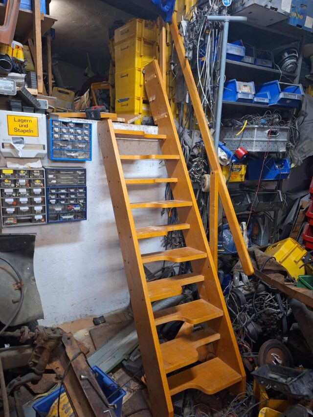 Die Kisten lagern bei mir auf dem Zwischenboden und bisher musste ich da immer mit der Leiter hochsteigen. Eine Quälerei bei der Anzahl der Kisten. Aber ich hatte ja eine Raumspartreppe besorgt. Bisher war sie nur angelehnt. Das ist sie immer noch. Aber ich habe die eine Seite oben abgesägt, das ist zum Herunterholen der Kisten einfacher und auf der anderen Seite habe ich das lange gelassen. Sollte schnell gehen und an dem überstehenden Seitenteil ist das Geländer im Original angeschraubt. Kann ich immer noch absägen und das Geländer tiefer anschrauben.
